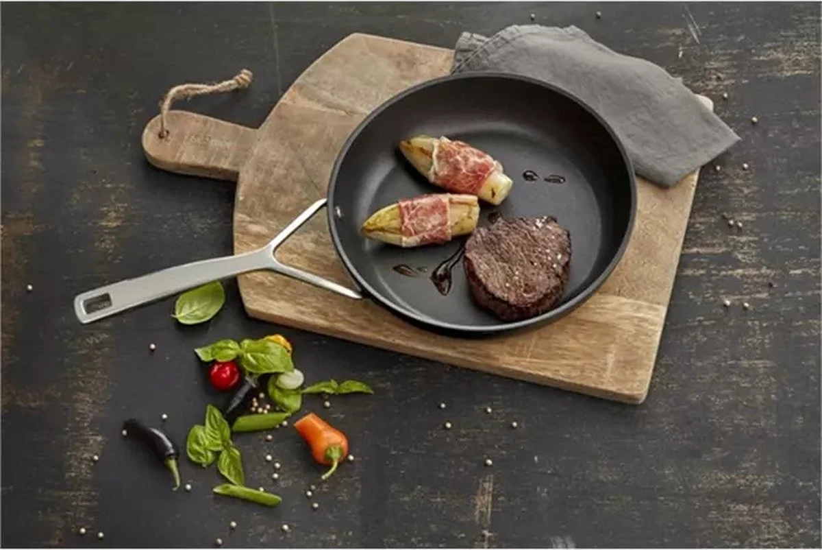 De ergonomische greep van de koekenpan is gemaakt van hoogwaardig RVS waardoor deze langer koel blijft. De greep is hittebestendig. Voor het maximale behoud van de antikleefeigenschappen kun je het beste keukengerei van nylon, siliconen of hout gebruiken en de pan met de hand af te wassen.